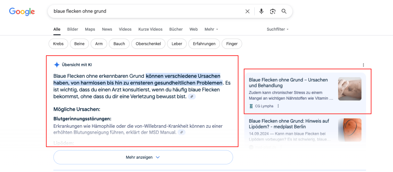 Beispiel: AI Overview eines Kunden für die Suchanfrage “blaue Flecken ohne Grund”